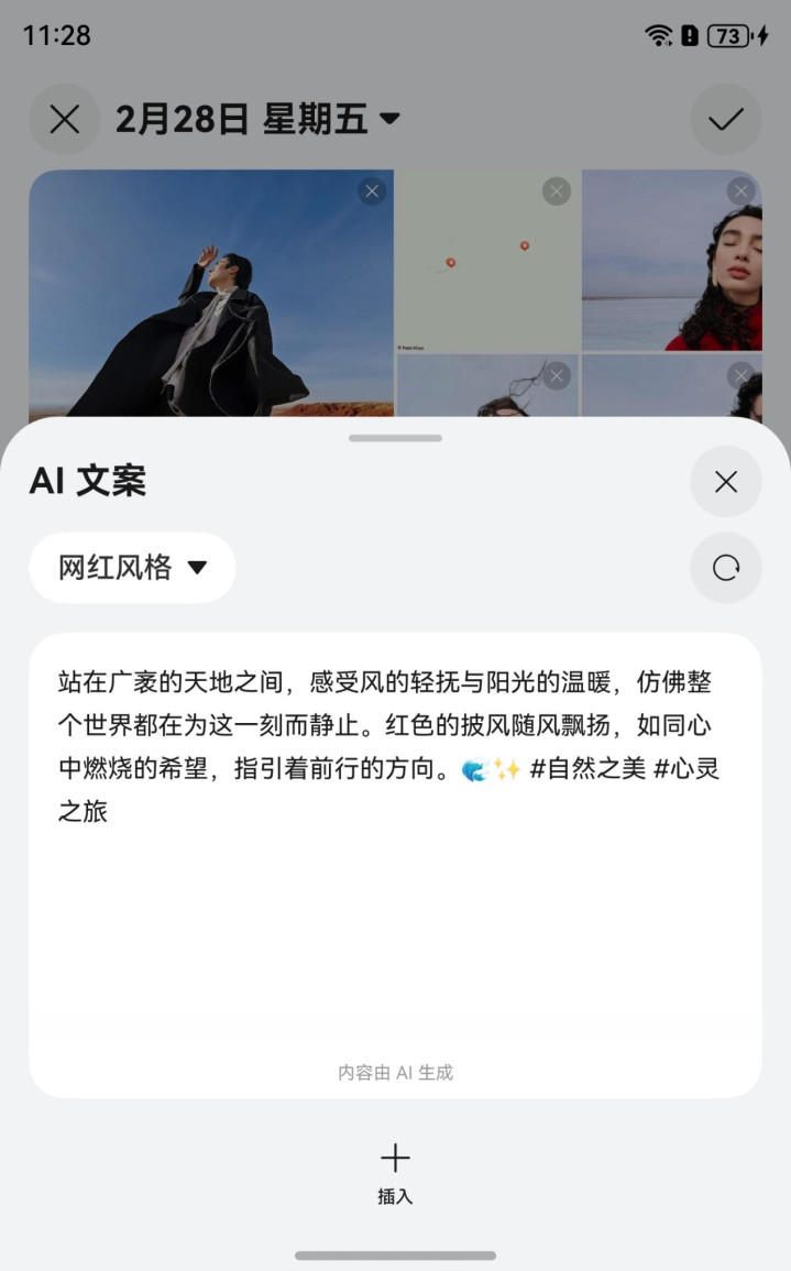 我怀着好奇点开了“AI文案”功能。当那段“网红风格”的文字——“站在广袤的天地之间,感受风的轻抚与阳光的温暖……”出现时,一股暖流击中了我。小艺时光机Agent用一种我从未敢尝试的、有诗意的语言,精准肯定了我当时内心的感受。